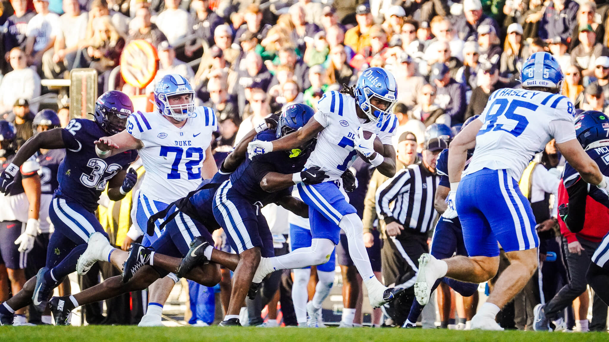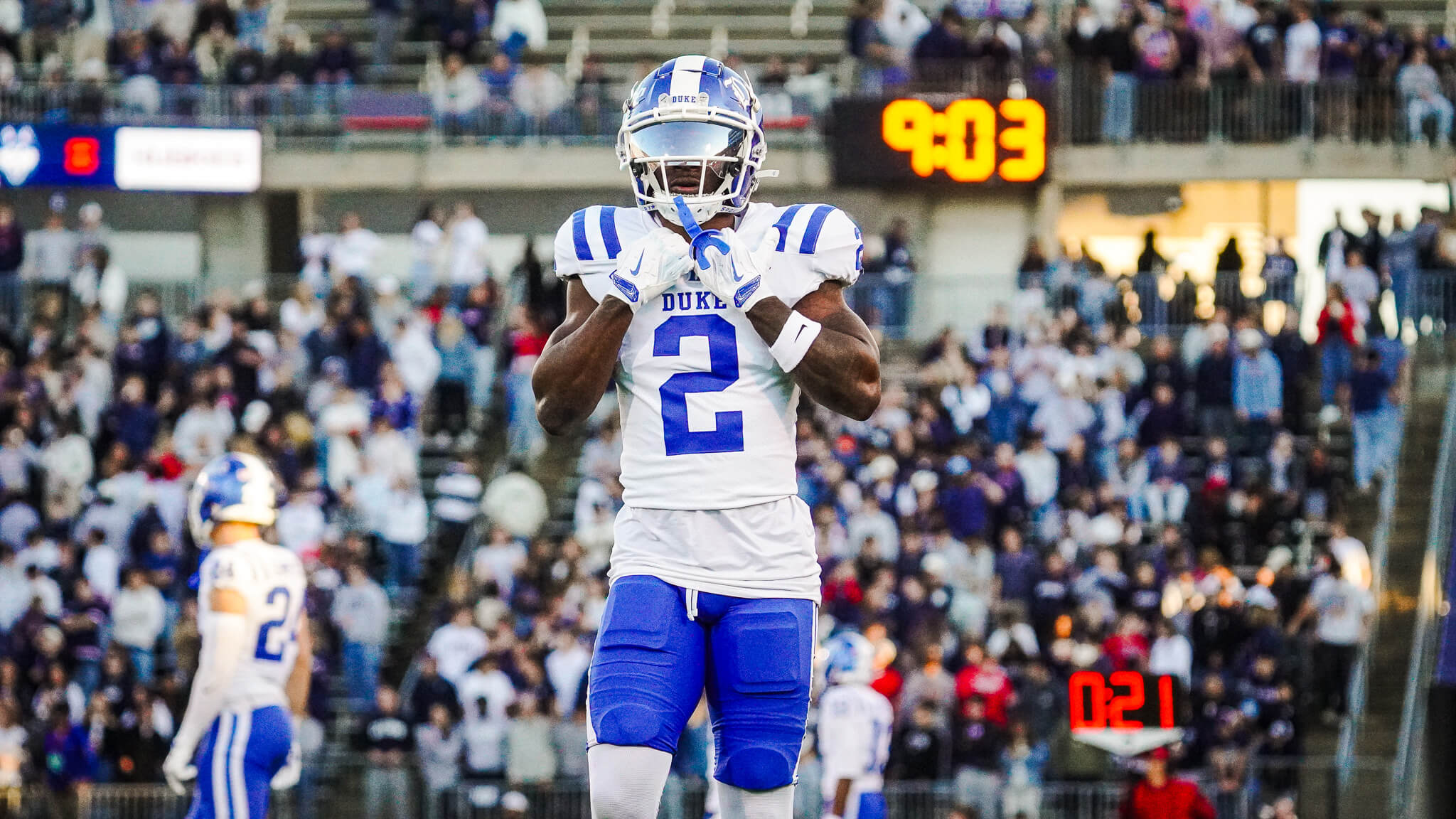 Duke struggled offensively in the first half, totaling just 54 rushing yards and 89 passing yards, but the Blue Devils came out firing in the second half. On their first drive of the third quarter, Duke executed a nine-play, 75-yard march capped by Sheppard’s second touchdown of the day, giving Duke a 21-20 lead. They followed with another methodical drive, nine plays and 75 yards, ending with Mensah’s 1-yard touchdown pass to tight end Landen King to extend the lead to 28-23. Going into the fourth quarter, the game was clearly heading for a dramatic finish.