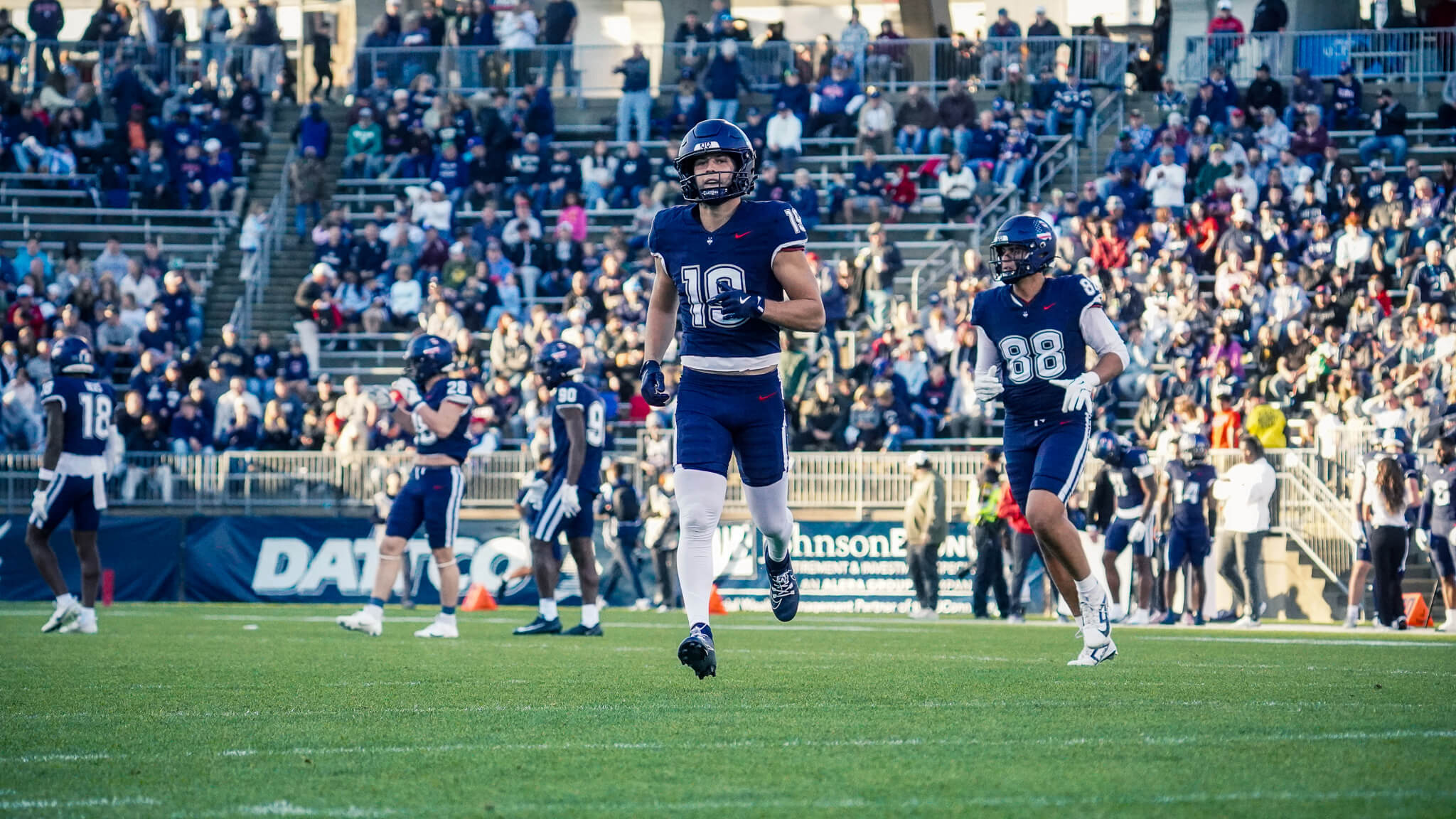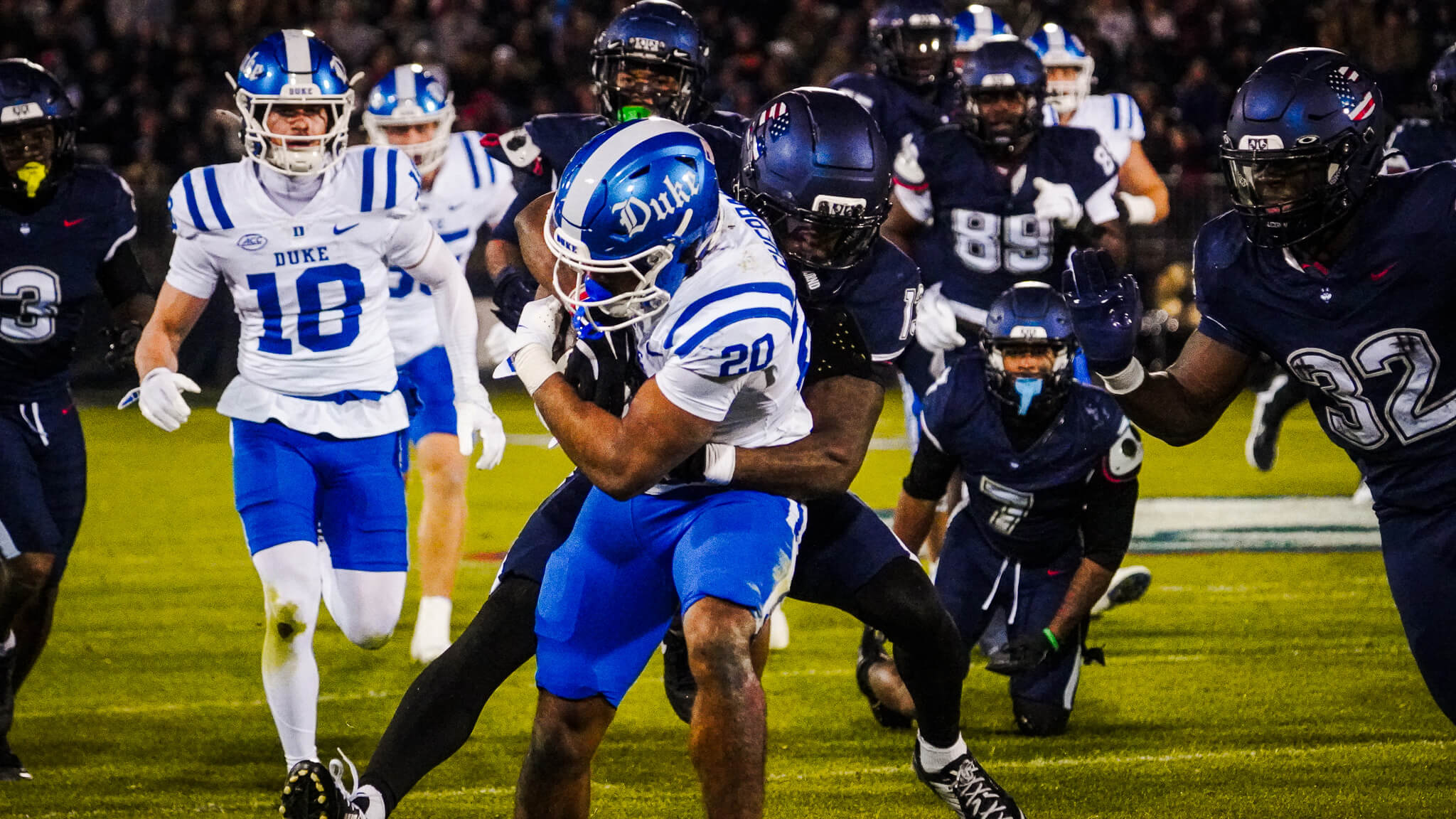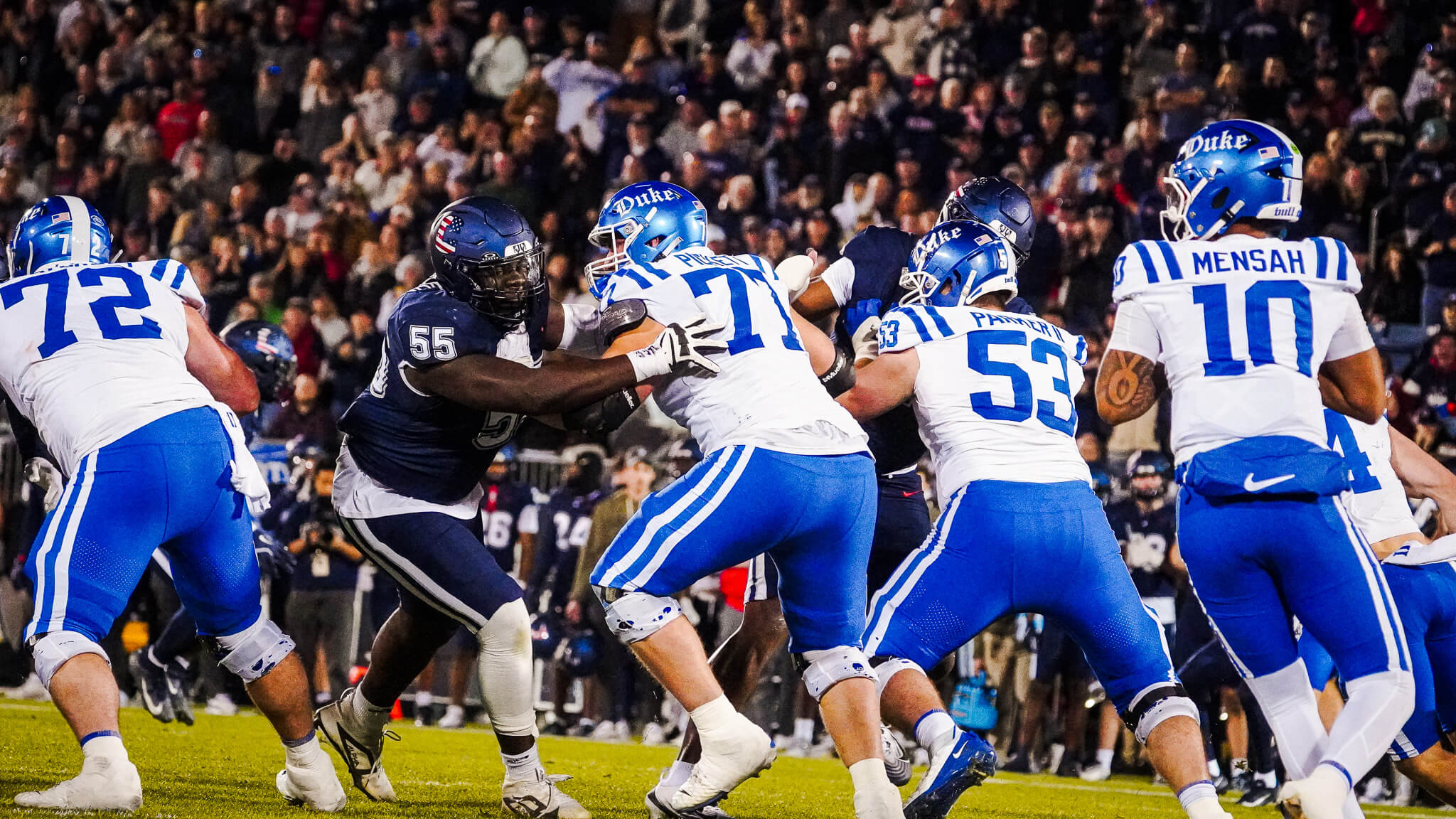When the game began, Pratt & Whitney Stadium had a playoff-like atmosphere. The crowd was electric, and both teams were ready for a battle. Despite their energy, the Huskies went three-and-out on their first drive. Duke responded immediately, marching down the field on a rapid three-play drive lasting under a minute. Running back Nate Sheppard finished the drive with a 15-yard touchdown run to give the Blue Devils an early 7-0 lead.