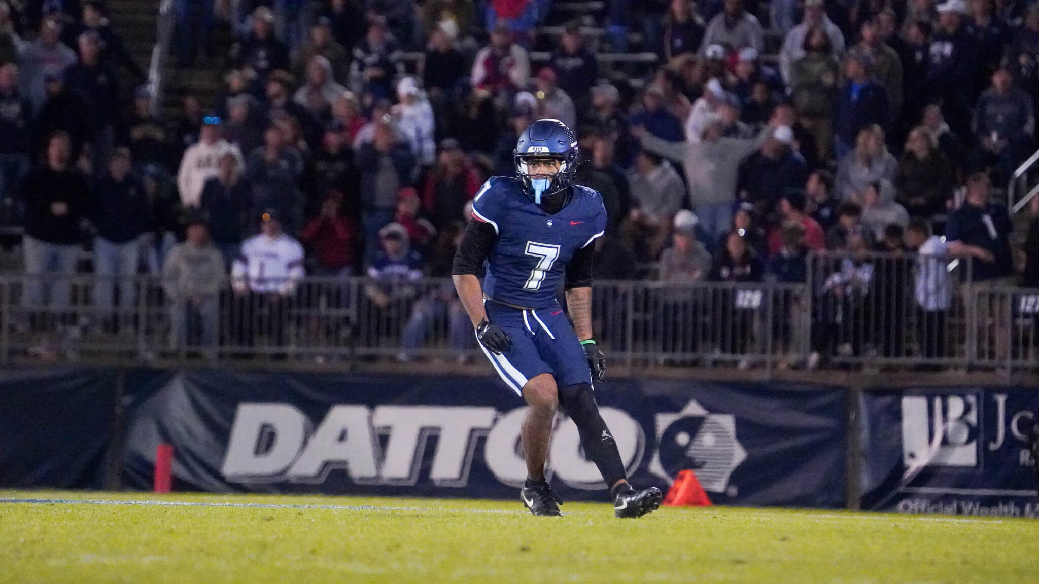 UConn answered quickly. On their next drive, the Huskies executed a seven-play, 70-yard drive over three and a half minutes, capped by quarterback Joe Fagnano’s 10-yard touchdown pass to tight end Juice Verneen to tie the game at 7-7. The momentum continued when Duke’s quarterback Daren Mensah threw a pass that was tipped and intercepted by UConn linebacker Bryun Parham. The Huskies turned the turnover into points, adding a 29-yard field goal from Chris Freeman to take a 10-7 lead. Duke was forced into another three-and-out, while UConn had a chance to extend their lead, only for Freeman to miss a field goal attempt. The first quarter ended with Connecticut ahead 10-7, though Duke still held the ball and aimed to respond.